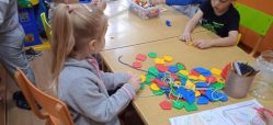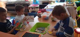 Ideja nam se svidela, pa pokušavamo da pronađemo još neka rešenja za pregrađivanje prostora uz pomoć traka i tako pravio pregradnu zavesu između dve prostorne celine od lanca nastalog spajanjem traka od kolaž papra. Deca seckaju, spajaju alke, mere dužinu, upoređuju dužinu traka, krate, prave nove.