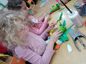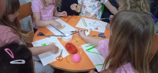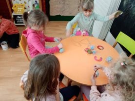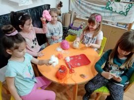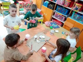 Došao na red i Uskrs. Rešavamo da kanape i vunicu iskoristimo tako što od vunice namotavanjem pravimo zeke, a uz pomoć balona, lepka i kanapa pravimo korpice za jaja.
