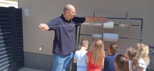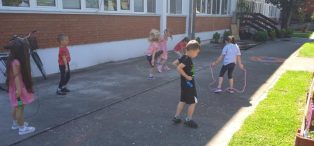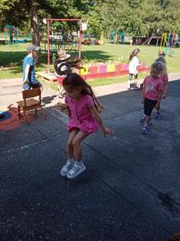 Uporedo sa našim radom sa kanapima u školskom dvorištu deca vežbaju da preskaču vijaču. Videvši ovo dolazimo na ideju da pozovemo jednu devojčicu da nam pokaže kako se to radi.