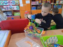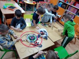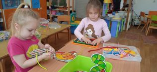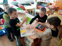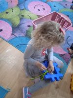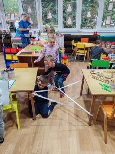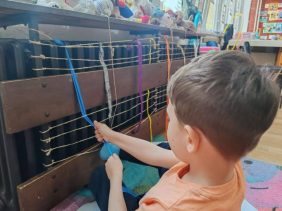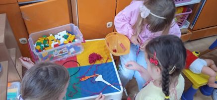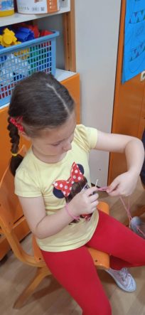Naše traganje se nadovezuje na igračke i didaktičke igre u radnoj sobi sobi koje u svom sastavu imaju pertle, kanape, trake…i igramo se njima danima. Tako kanapi i pertle postaju deo svakodnevne upotrebe u prostoru za konstruisanje. Deca u igri koriste i kocke koje imaju rupice i od njih prave ogrlice, hobotnice….