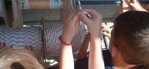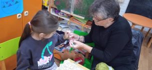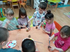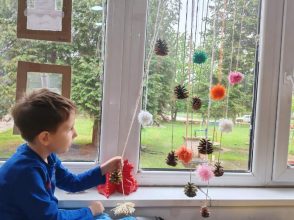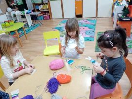 Nakon ovog inspirativnog druženja sa bakama, rešavamo i da naučimo da pravimo bućkice od vunice koje se stavljaju na pletene kapice i šalove. Rešavamo da od njih napravimo mobaj. M.V. daje ideju da ofarbamo i šišarke i da zakačimo i njih.