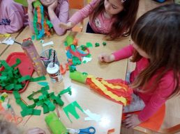 Prilikom otvorene igre u kuhinji devojčice počinju da koriste rečenicu „Slatka mala izvrnuta torto“ koja je bila vezana za naš prethodni projekat. Jedna od njih uzima iseckane satenske trake i počinje da duva kao da je to vatra koja izlazi iz zmajevih usta kao u crtanom filmu. Tako dolazimo na ideju da napravimo „Zmajeve koji bljuju vatru“ od ubrusa i traka od krep papira.