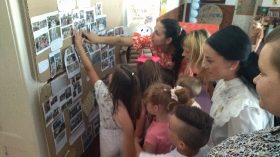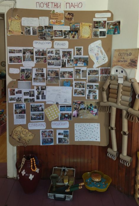Tokom projekta zajedno sa decom formirali smo početni i procesni pano.Razmišljali smo, razgovarali i birali najzanimljivije fotografije i produkte našeg rada koji će biti izloženi. Deca su sa ponosom predlagala šta žele da pokažu crteže, zajedničke radove, fotografije sa aktivnostima i sve ono što predstavlja tragove naše avanture i istraživanja. Naš pano tako postaje mesto koje priča priču o svemu što smo zajedno naučili, otkrili, istražili.
