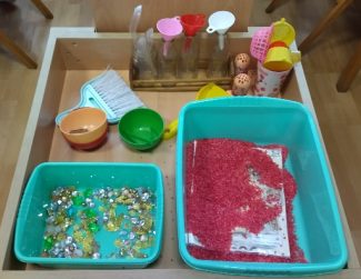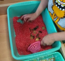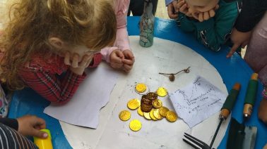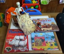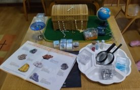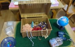 Pošto su deca pokazala veliko interesovanje za temu“Potraga za blagom“,odlučila sam da dodatno podstaknem njihovu radoznalost i istraživački duh.U grupu sam unela male kovčežiće ispunjene raznim „blagom“:šarenim nakitom,starinskim novčićima,knjigama o piratima,odštampane mape sa blagom,minerali raznih oblika i boja kao i lupe koje su odmah podstakle igru i istraživanje.