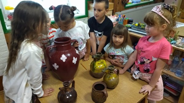 Po povratku u radnu sobu, proučavamo stare posude: ćupove, krčage. Razgovaramo čemu su koristili ljudima u tom periodu. Na dečiju inicijativu pravimo ove posude od plastelina.