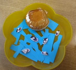 Čitamo priču:“Školjkica i zrno peska“.Priča nas je inspirisala da napravimo bisere i da ih stavimo u školjke koje nam je doneo Vuk.Bisere pravimo od belog plastelina u koji smo stavili sjajni gliter prah.