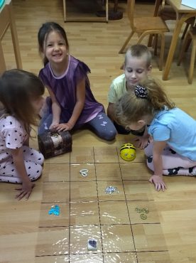 Tokom kišnih dana potragu za blagom smo nastavljali u radnoj sobi.Igra Bee Bot robotom „Potraga za blagom“.Po poljima su poređani razni kristali,poludrago kamenje,na kraju se nalazi kovčežić za blago.Dete usmeri Bee Bot robota ka određenom kristalu kada stigne do njega imenuje ga i kaže šta zna o njemu,zatim ga stavi u kovčežić.