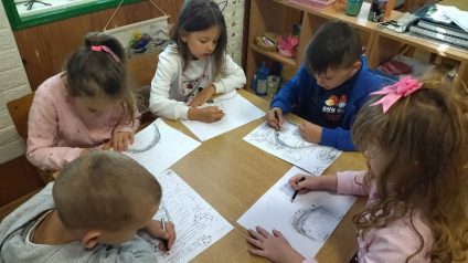 Saznajemo da ugljem možemo da crtamo,kupujemo u knjižari ugalj za crtanje i pristupamo stvaranju umetničkih dela.Pod utiskom posete pećini,deca su crtala pećinu Ravništarku.