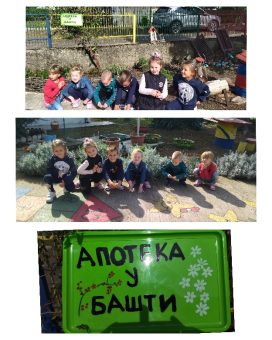 U našem dvorištu imamo dosta lekovitih biljaka, jednu malu baštu,označili smo pored svake biljke kako se zove. Razmišljali smo kako da nazovemo našu baštu i rešili da to bude naslov priče koju smo čitali APOTEKA U BAŠTI. Sada svako može da se posluži iz naše apoteke ako se razboli, mi ćemo preporučiti koju biljku da koristi i kako.