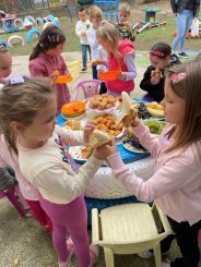 Na naš poziv u posetu nam dolaze naši drugari iz Makca. Imamo slične projekte i poželeli smo da razmenimo ideje i saznanja.Pokazujemo im našu apoteku u bašti, upoznajemo ih sa aktivnostima u okviru našeg projekta,razmenjujemo poklone. Roditelji su nam pripremili zdravo posluženje ( projice, kolače od voća, limunadu) u kome uživamo u dvorištu uz igru.