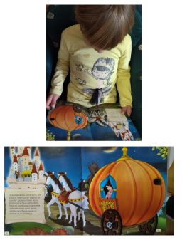 Prelistavajući slikovnice Dunja je u slikovnici: „Pepeljuga“ primetila kočiju u obliku bundeve,pokazala nam je ovo svoje otkriće. Čitamo slikovnicu:“Pepeljuga“.
