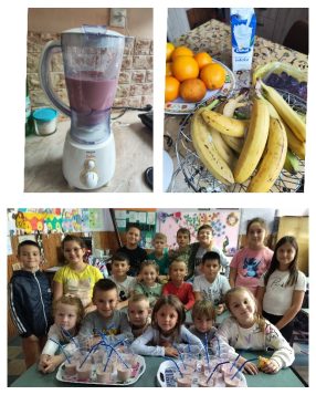 Dan zdrave hrane provodimo u gostima kod naših drugara iz škole.Oni sa svojim učiteljicama prave voćni napitak SMUTI.Ovaj napitak smo prvi put probali i veoma nam se svideo. Decu je ukus podsetio na sladoled i voćni jogurt.Razgovaramo koliko je voće zdravo.