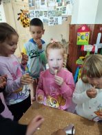 Učiteljice su deci pustile muziku pesmicu:“Voće“ Lj.Ršmović, hor: „Kolibri“. Po povratku kod nas u grupu potražili smo ovu pesmicu na jutjubu jer nam se veoma dopala, i već je pevušimo.