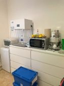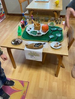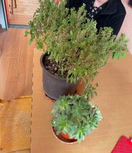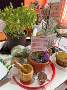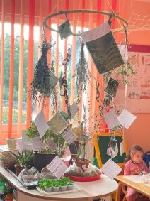 Ubrzo su usledile i promene u prostoru. Biljke koje smo našli i ubrali u šetnji okačili smo da se osuše, saksije sa lavandom, bosiljkom, čuvarkućom i alojom (koju nam je donela Pavlova mama) stavili smo na sto, u centralnom delu prostorije. Deca su tu postavila i avan, lupe, mikroskop, pincete, razne posudice… Dodali smo enciklopedije, fotografije, tekstove o biljkama, postere i tako formirali novu prostornu celinu koju su deca nazvala „Naše lekovite biljke“.