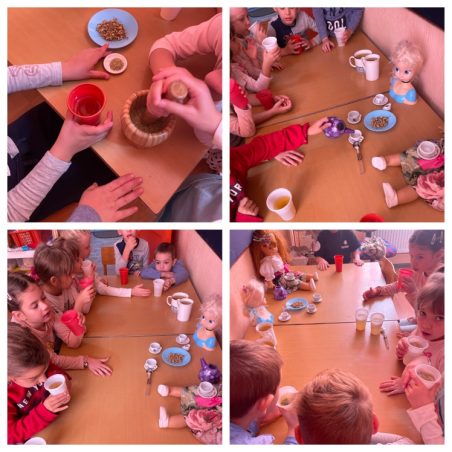 Na ideju devojčica Danice, Ljubice i Marije organizovali smo čajanku. Skuvala sam deci čaj od kamilice i zajedno smo uživali u njegovom ukusu, mirisu, lekovitim svojstvima. Marija je i lutkama „kuvala“ čaj od kamilice „da se ugreju i da im prođe prehlada“.