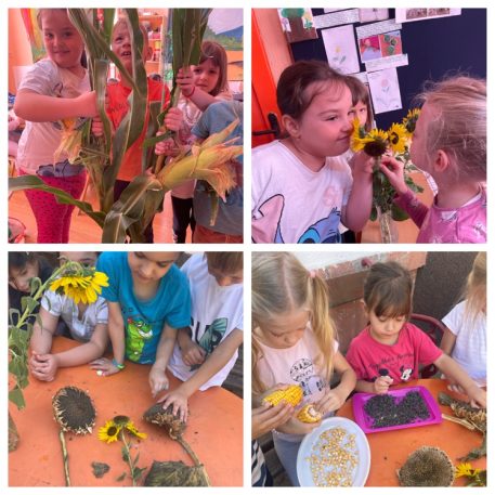 Saznali smo iz enciklopedija i sa interneta da su suncokret i kukuruz žitarice i da su veoma važni za zdravlje i ishranu ljudi i životinja, baš kao i pšenica, ječam, raž… Saznao sam : „Od suncokreta se pravi ulje, a od pšenice hleb“ rekao je Bogdan. Deca su nastavila igru plodovima kukuruza i suncokreta. Krunili su ih, pravili razne igračke i dekoracije od semenki, ali i od listova i stabla. Dodala sam im i plastelin, vunicu, grančice…