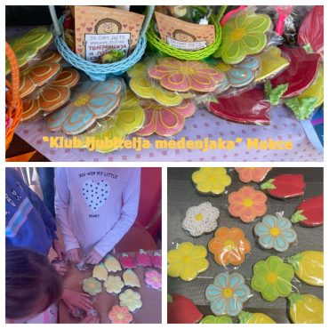 Na radionici sa mamama napravili smo prelepe medenjake u obliku cvetića (i tako se pridružili humanitarnoj akciji za lečenje naše drugarice Lee). Tom prilikom smo sa mamama razgovarali i o medu, glavnom sastojku od kog se prave ukusni medenjaci. Mame su nam objasnile da se pčele, koje prave med, spuštaju na cvetove i uzimaju polen samo sa lekovitih biljaka.