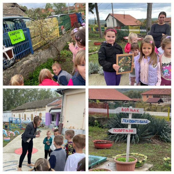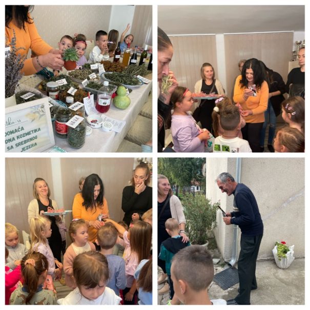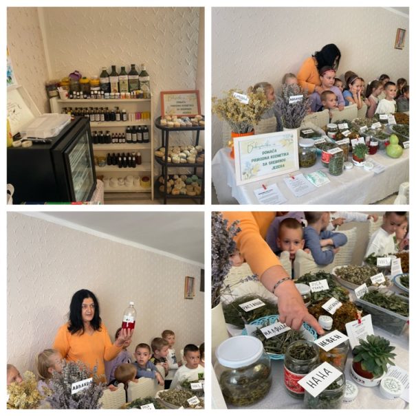 Posetili smo i teta Zoru, pomoćnu radnicu u vrtiću u Kisiljevu, koja je veliki poznavalac lekovitog bilja. Pokazala nam je mnogo osušenih biljaka, koje ona uzgaja i neumorno sakuplja, pričala nam o njihovim lekovitim svojstvima, a potom i o tome šta ona sve od njih pravi. Deca su prilazila i razgledala biljke, mirisala ih, dodirivala, postavljala teta Zori mnogo pitanja o njihovim nazivima, gde rastu, kako ih ona uzgaja. Zatim je objasnila detaljno i strpljivo kako pravi lekovite meleme, serume, kreme, masti, šampone, sapune i još mnogo toga. Deca i roditelji su je pažljivo slušali, pitali za odredjene preparate, a ona je strpljivo odgovarala i pokazivala svakojake lekovite proizvode. Potom su deca i roditelji dobili i poklone – mirisne sapune od biljaka i kozjeg mleka.