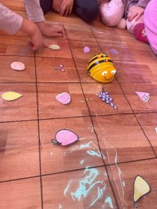 Odmah nakon posete profesorke Jelene dobili smo zanimljive poklone – bee bot robote. Deca su bila uzbuđena jer nikad ranije nisu mogla da koriste robote. Nacrtala sam im šemu, osmislili smo zadatak za robote i nakon pojašnjenja kako roboti rade, igra sa njima postala je jedna od najzanimljivijih svoj deci. Deca su, programirajući robote, uspešno sakupljala npr. samo žute listiće, crveno voće, kiselo voće i sl. Igra je bila svaki put drugačija i zanimljiva.