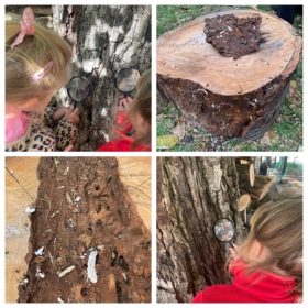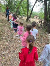 Prateći Bogdanovu mapu došli smo do šumarka u kom smo pronašli stari panj sa mahovinom i pečurkama. Na oborenom stablu videli smo rupice i tunele i puno mrava u njima. Anastasia je rekla : „Ovde žive mravi. Napravili su tunele i tu im je kućica, u ovom drvetu.“ Teta Tanja je deci ispričala da je u jednom od tih stabala i vevericina kućica. Ona ju je videla kako skakuće sa grane na granu i uskače u jednu od rupa u izbušenom starom stablu. Shvatili smo da je profesorka Jelena bila u pravu – moć biljaka jeste da pruže sklonište i hranu drugim živim organizmima. Čak i ljudi prave kuće i nameštaj od drveta.