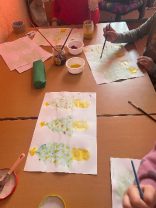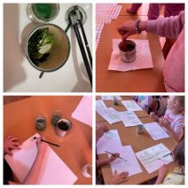 Marija i Danica su se setile da je jedna od moći biljaka da dekorišu i ulepšaju prostor u kom boravimo. Predložile su da novogodišnje dekoracije budu u skladu sa projektom, izrađene od biljaka. Na Pinterestu sam pronašla kako da napravimo boje od biljaka. Nabavila sam lukovinu za braon boju, spanać za zelenu, cveklu i višnju za crvenu, kurkumu za žutu. Sve sam ispasirala, prokuvala i dodala malo limunovog soka. Deca su bila oduševljena iako boja nije bila veoma intenzivna. Slikali su jelkice, irvase , poklone…