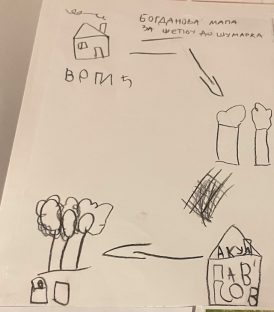 Kako su vremenske prilike bile povoljne rešili smo da izađemo u šetnju i otkrijemo moć biljaka da pružaju sklonište i hranu životinjama i drugim živim organizmima. Bogdan je predložio da odemo do šumarka nedaleko od vrtića. Nacrtao je i mapu kako da lakše stignemo do tog šumarka.